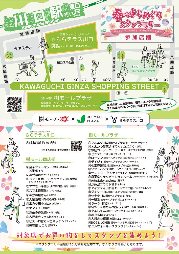 川口駅周辺の商店街とショッピング施設が連携して開催する、春恒例の「春のまちめぐり スタンプラリー」。 今年は 樹モール商店街・樹モールプラザ・三井ショッピングパーク ららテラス川口 の約80店舗が参加し、街全体で楽しめる大型イベントとしてパワーアップしました。